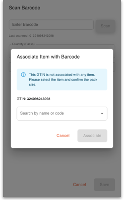 - When the item and pack size are correct, tap on the Associate button to connect the GTIN to the item.