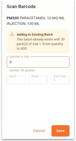 - The Expiry field contains the expiry date that was in the barcode. This will be left empty if there was no expiry date in the barcode.