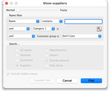 Set any of the filters you want to use and then click on the Find button to display a list of suppliers that match your filter settings (just click on the Find button without editing anything if you just want a list of all suppliers in your store):