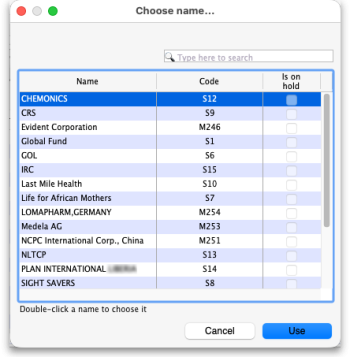 You can add multiple suppliers by holding down the control key (command key on Mac) and clicking on those suppliers you wish to add. Once you have selected a supplier or suppliers, click the Use button to add them to the list. To create a new supplier, click the New button.