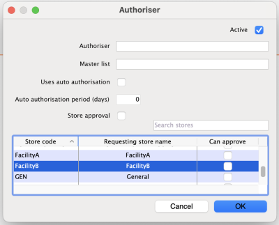 • Store approval: This is not checked by default. If this is checked, you can set the rule to only need approval if the request comes from the stores checked in the list. If store approval and no masterlist is set, then all items for the requisition need approval. If masterlist and store approval are both set, then only require approval if from the requesting store and if the item is part of the masterlist. A request from facility (not a store) can also be included by adding a tag “remoteAuthorisation” in the name.