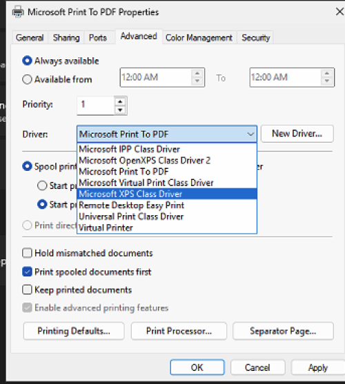 - Click on Microsoft Print to PDF → Go to Printer Properties → Advanced → Select Driver Microsoft XPS class Drive → Click Apply and Ok