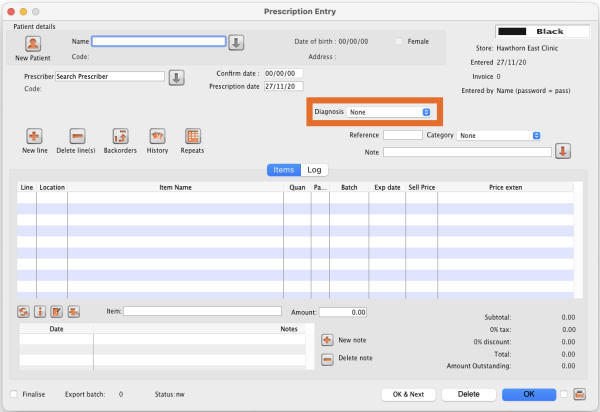 The diagnosis selected will be saved against the prescription together with all other information provided in the Prescription entry window.