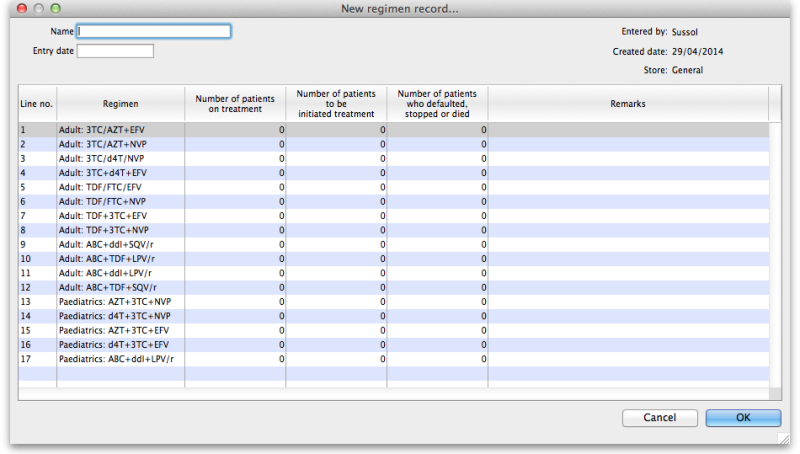 mSupply allows you to record ARV regimen data; you can record for each customer how many patients are following particular regimens, how many have defaulted on their regimen, and how many have died while on different regimens. There is a fixed list of regimens which applies to all customers.