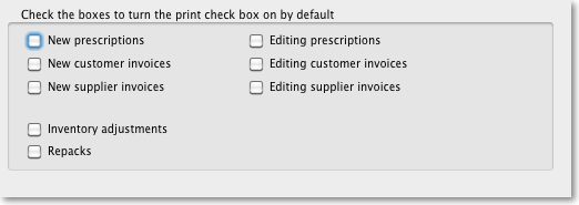 Checking these boxes means that the printing checkbox will be checked by default when the corresponding window is opened.